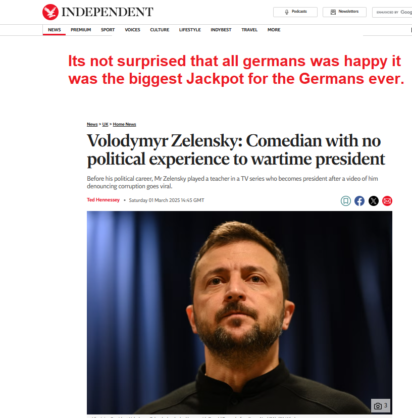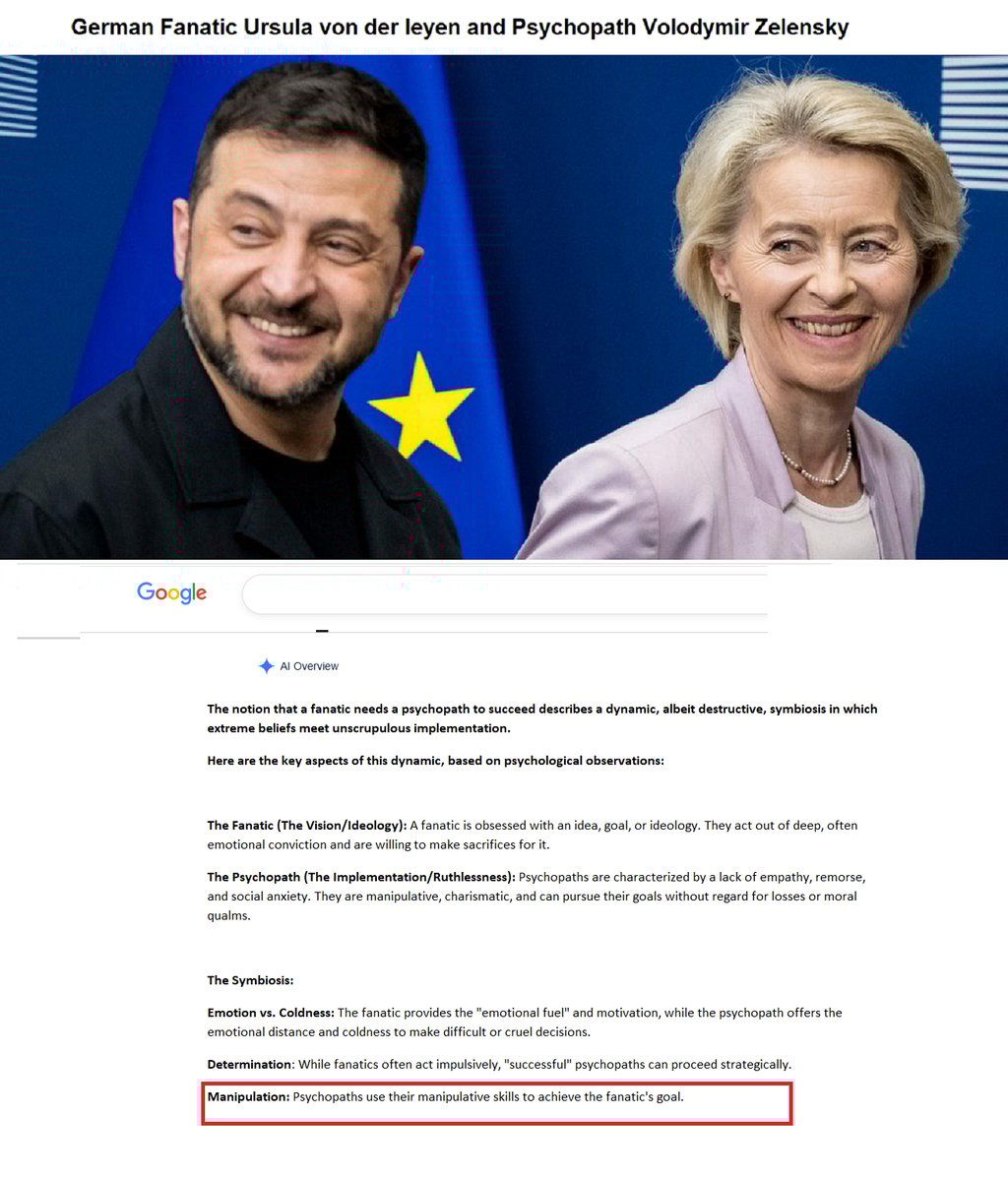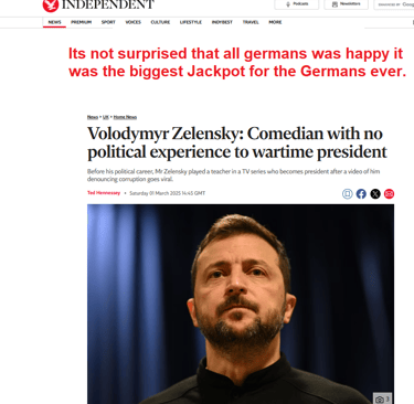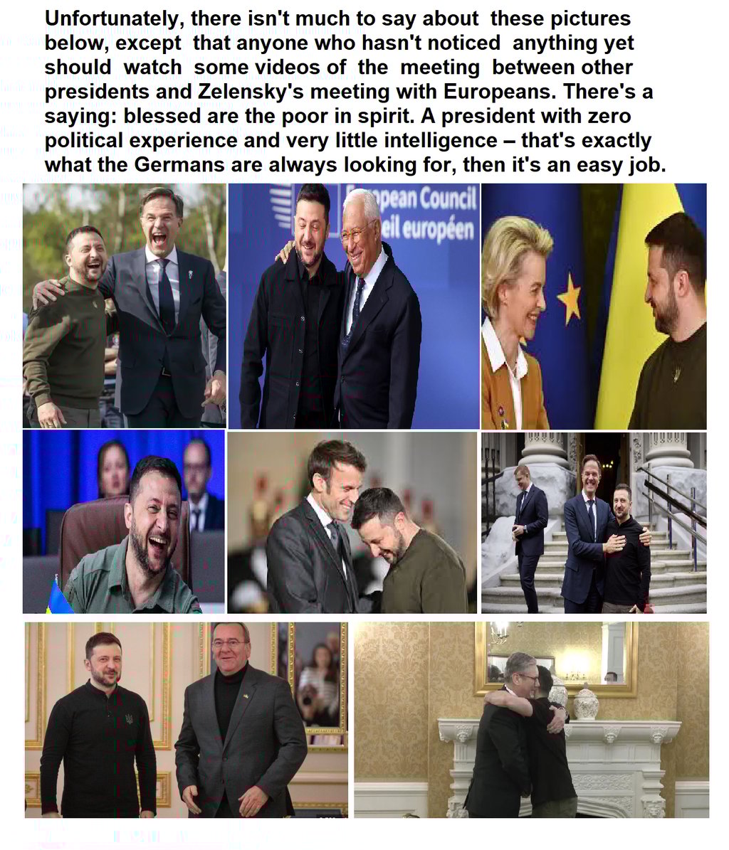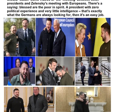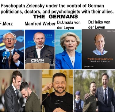But let's look at the facts, and they are clear: everyone knew that Volodymyr Zelenskyy had zero political experience, and therefore no political intelligence, nor he is intelligent in general. The Germans knew this because, after all, everyone knew it. In addition, he is a psychopath, or at least has psychopathic traits no empathy, no compassion. And above all, the long period of time which the Germans saw and which has now been proven after almost four years is crucial. Zelenskyy isn't stopping, as Donald Trump said. Give Russia something; no he didnt, probably because he can't now, even if he wanted to, because as can be seen from all the reports, the Germans have already taken control of Ukraine. They are in charge, starting with Ursula von der Leyen, who says borders cannot be moved and Russia must bring back all the children, and German Chancellor Friedrich Merz, who ordered Zelenskyy not to let young men aged 18-24 leave Ukraine so that they fight. The influence of the Germans and the fact that they planned and started the war is now fully visible when one links together everything that has happened in the last 7 years since Zelenskyy's election as president.