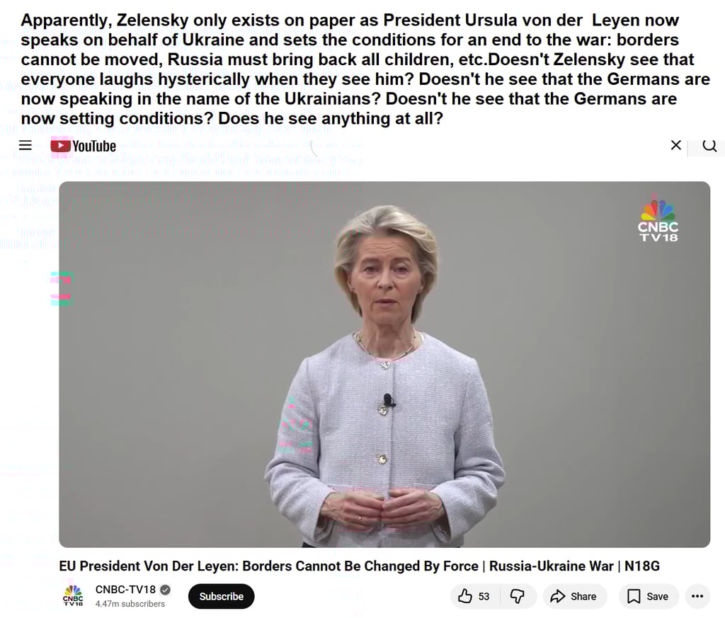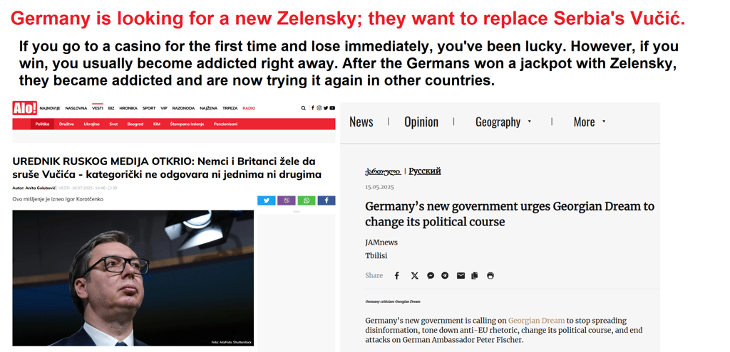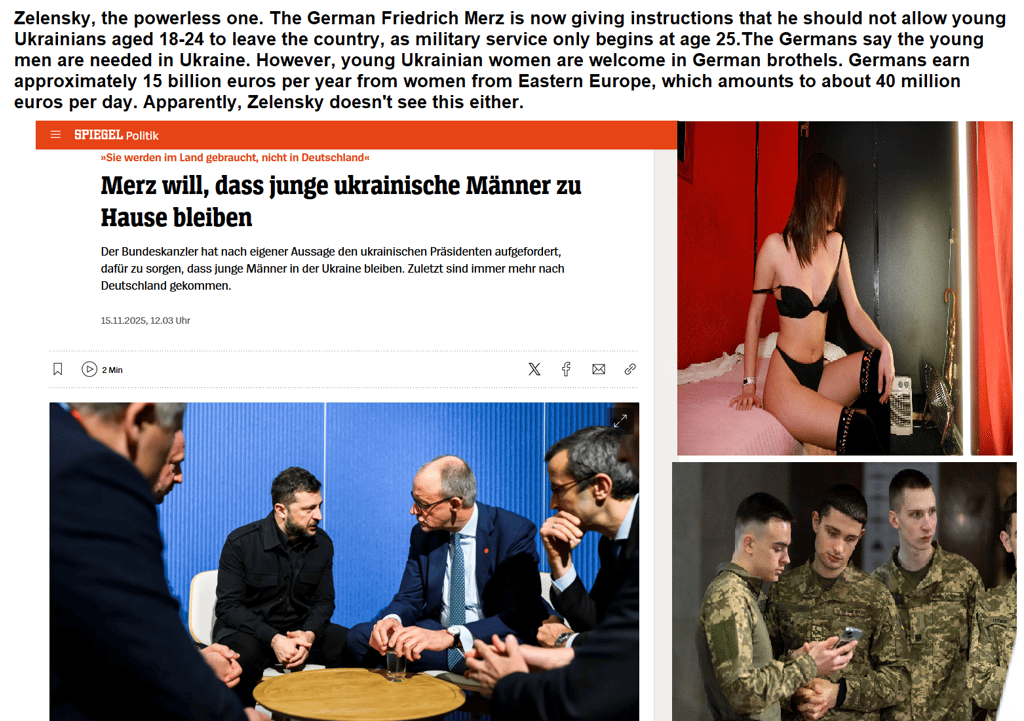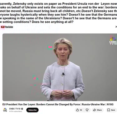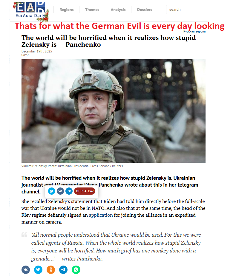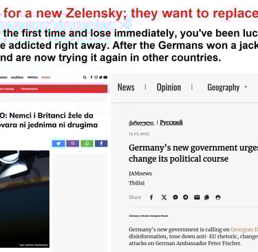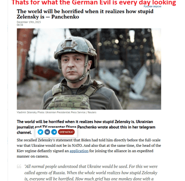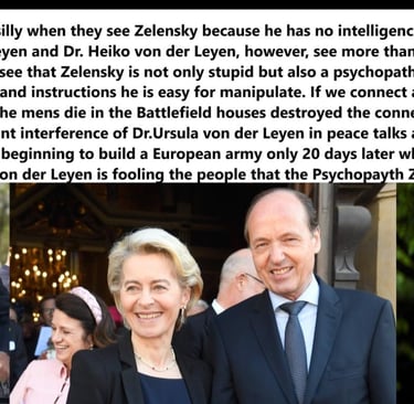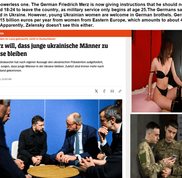 But let's look at the facts, and they are clear: everyone knew that Volodymyr Zelenskyy had zero political experience, and therefore no political intelligence, nor he is intelligent in general. The Germans knew this because, after all, everyone knew it. In addition, he is a psychopath, or at least has psychopathic traits no empathy, no compassion. And above all, the long period of time which the Germans saw and which has now been proven after almost four years is crucial. Zelenskyy isn't stopping, as Donald Trump said. Give Russia something; no he didnt, probably because he can't now, even if he wanted to, because as can be seen from all the reports, the Germans have already taken control of Ukraine. They are in charge, starting with Ursula von der Leyen, who says borders cannot be moved and Russia must bring back all the children, and German Chancellor Friedrich Merz, who ordered Zelenskyy not to let young men aged 18-24 leave Ukraine so that they fight. The influence of the Germans and the fact that they planned and started the war is now fully visible when one links together everything that has happened in the last 7 years since Zelenskyy's election as president.
