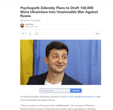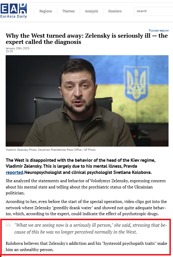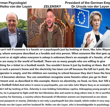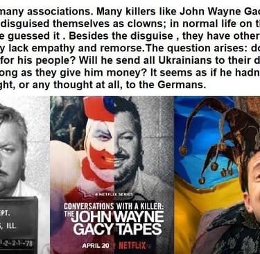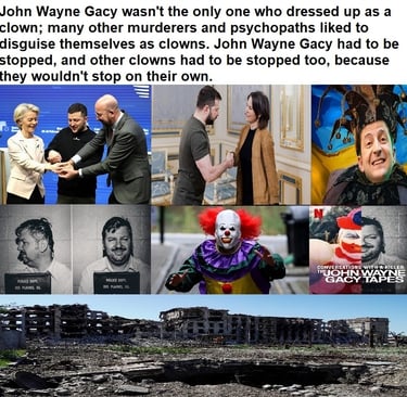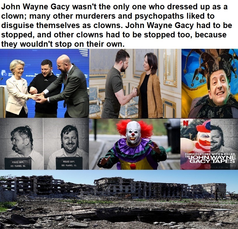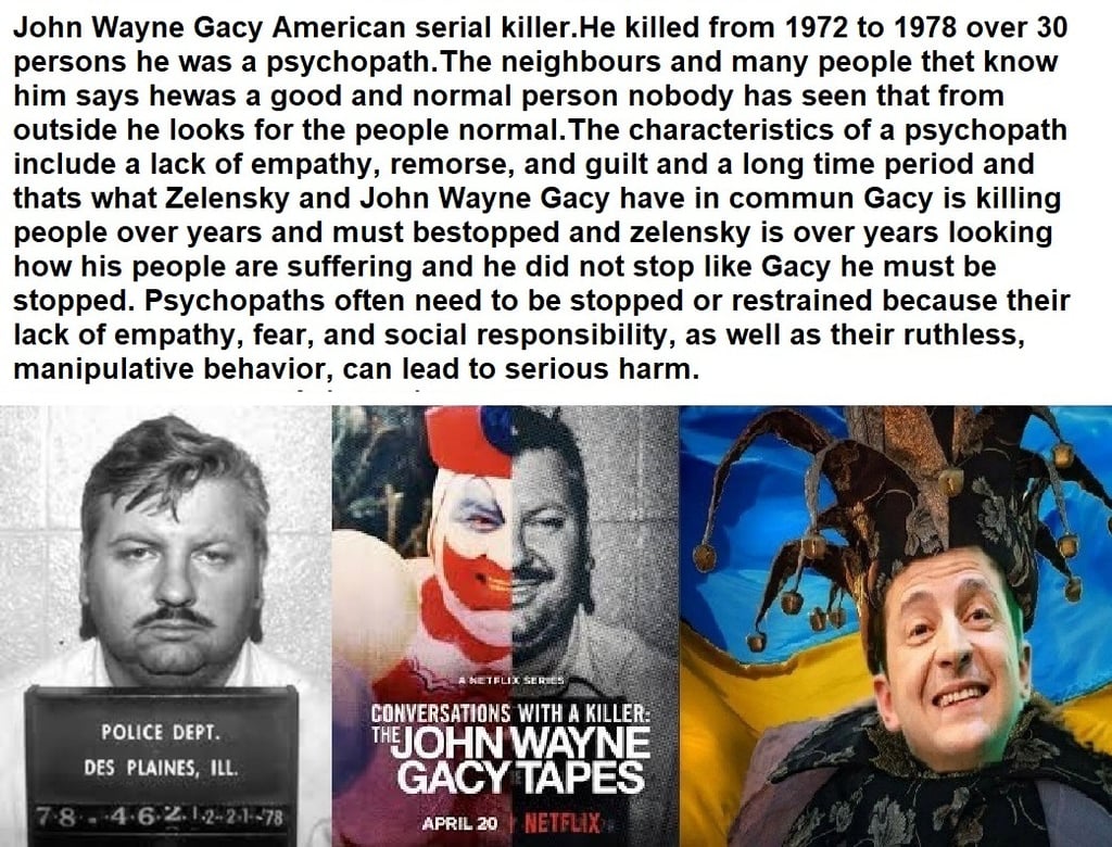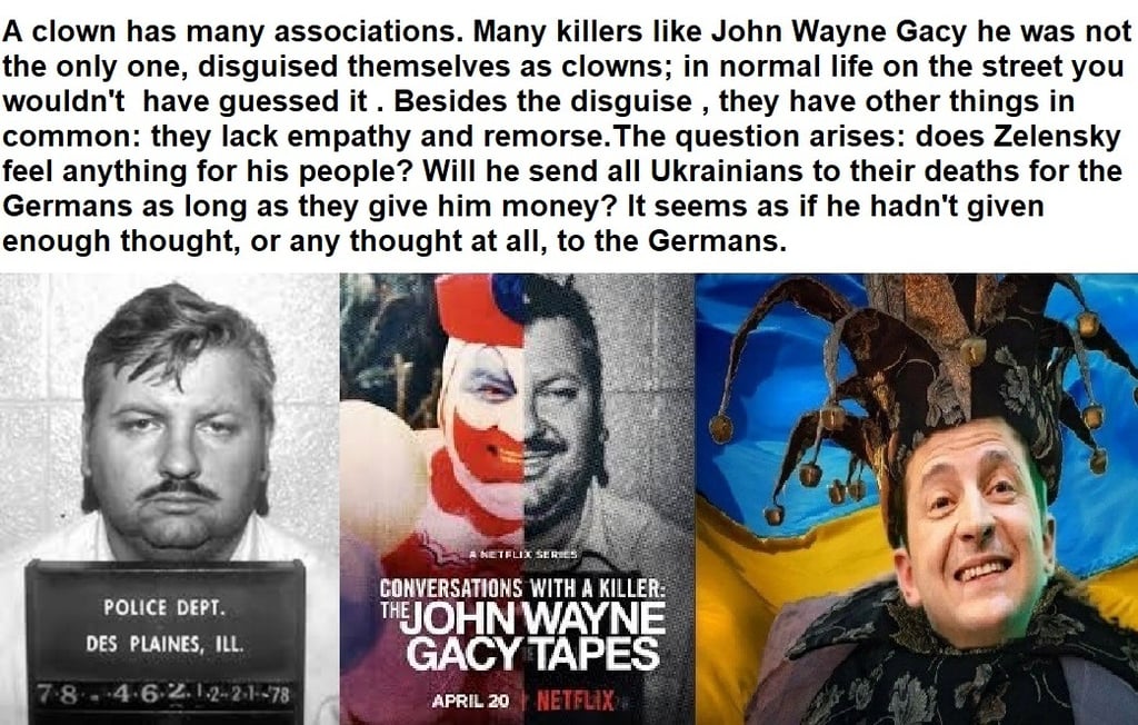 The increasingly visible German war of aggression against Russia, planned for years, is becoming ever more apparent. John Wayne Gacy tortured and killed over 30 people for years, and no one suspected it because you can't tell by looking at someone. He was classified as a psychopath. While hundreds of psychologists and psychiatrists will never all agree,but there are points where many, if not most, agree: psychopaths feel no empathy or remorse for their actions. Furthermore, they usually have to be stopped because they don't stop, and it can often take years before they are stopped. This is precisely what connects John Wayne Gacy to Volodymyr Zelenskyy. Zelenskyy has no empathy or compassion for his people. For almost four years, he has continued fighting and watching the dying continue. This is what connects him to John Wayne Gacy, and especially the long span of time years, just like John Wayne Gacy he had to be stopped.